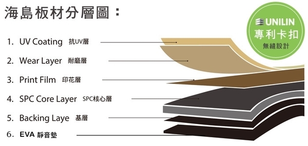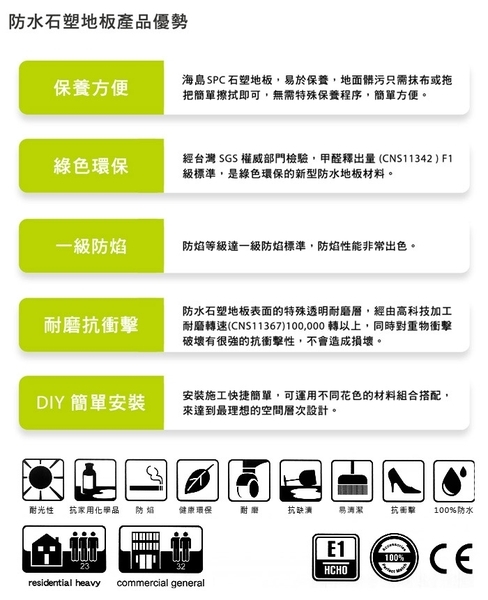 、100%防水、一級防焰、防蛀蟲及快速安裝等特點,板材穩定度較一般木地板