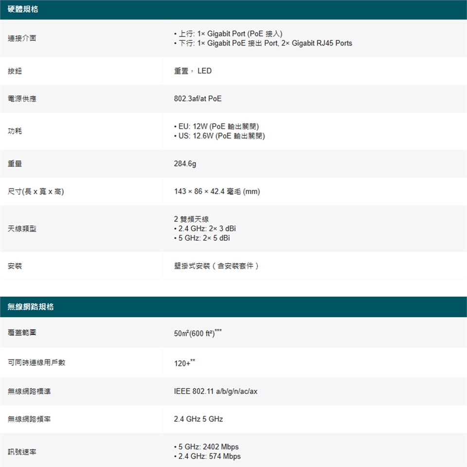 最高 3.0 Gbps Wi-Fi 6 速度:2.4 GHz 574 Mbps,5 GHz 2402 Mbps*