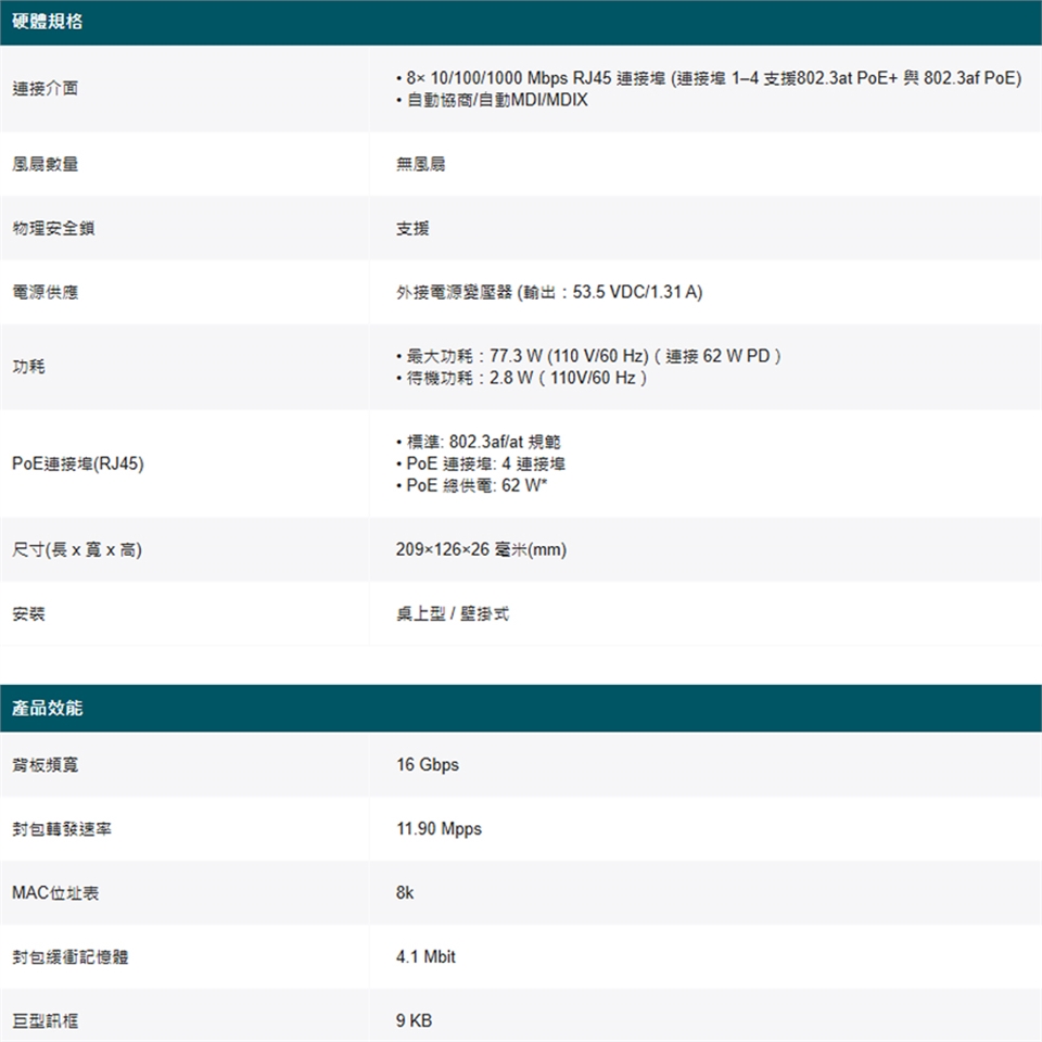 8× Gigabit 連接埠 (4× 802.3at/af 規範 PoE+ 連接埠)