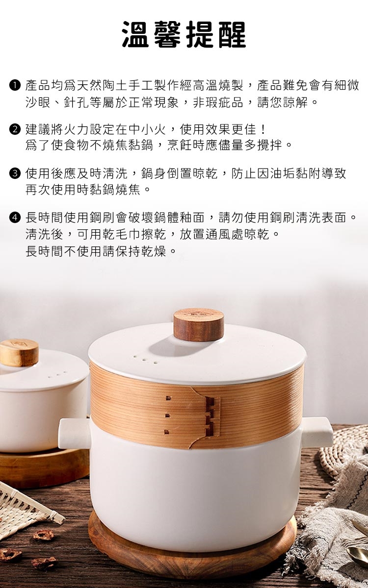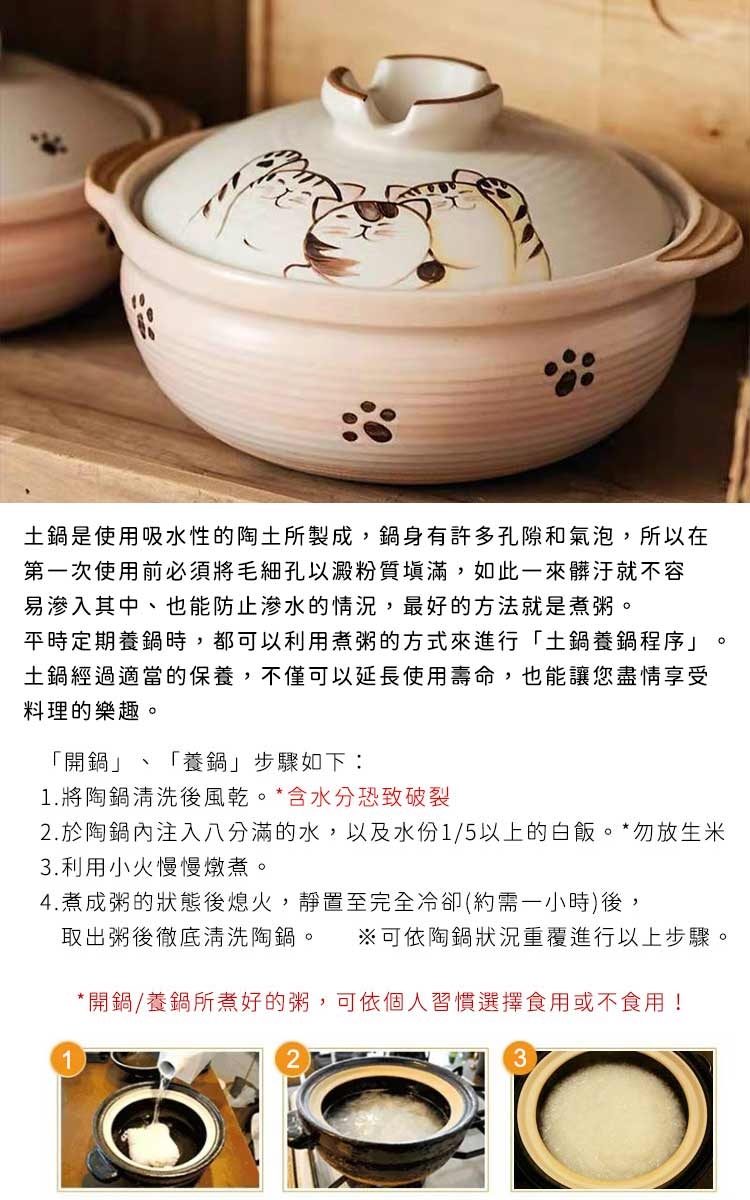 陶鍋是利用粗士製作而成,使用前需先填阻鍋體面的毛細孔,此使用陶鍋前,請務必先煮一次粥來塤阻鍋體面的毛細孔,利用米飯中的澱粉,將粗士的空隙填滿,防止水分溢散,也能確保陶鍋的使用壽命!