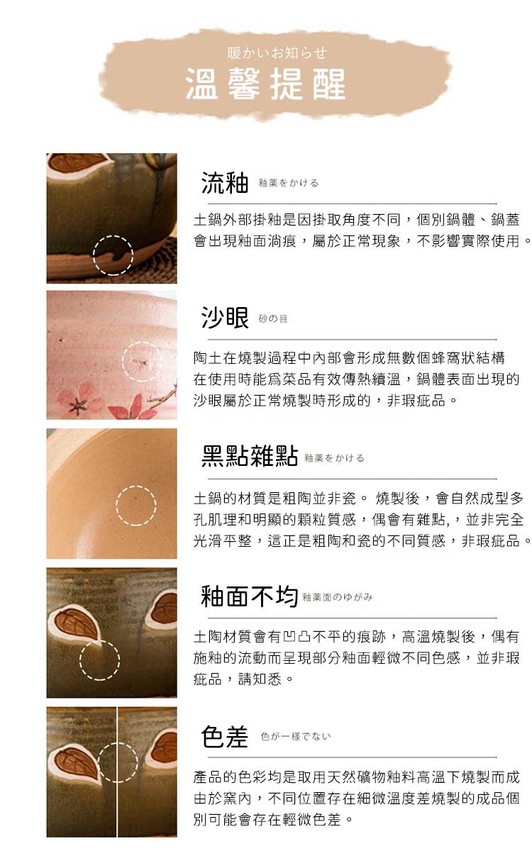 陶鍋會有顆粒、黑點、凹凸、上色不勻、流釉等現象!由於是手工製作,線條、紋理也會略有不同,屬正常工藝現象非瑕疵品!