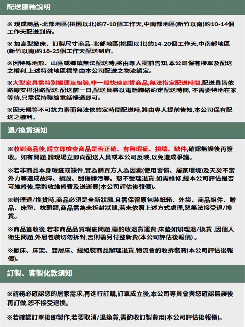◆ 下訂前請確認好尺寸與規格,訂錯規格、顏色不符等非商品瑕疵退貨,將酌收拆裝費,運費1500 (當場支付)