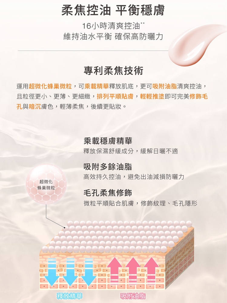 高效控油配方,能有效吸附多餘油脂,平衡皮脂分泌,並舒緩曬後不適,持久抗油光。專利柔焦技術,同時修飾毛孔瑕疵,呈現粉嫩柔霧效果,使肌膚更加細緻。運用光穩定廣譜防禦機制,長效抵禦紫外線UVA及UVB,預防曬黑及曬老,實現外防禦、內修護的全方位防曬效果。全配方不含海洋與珊瑚有害成分。