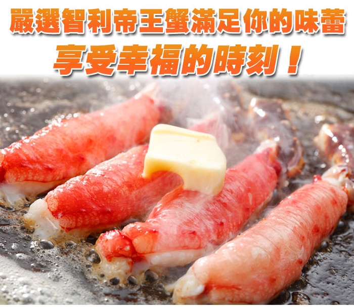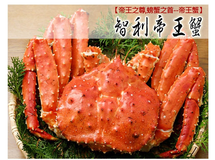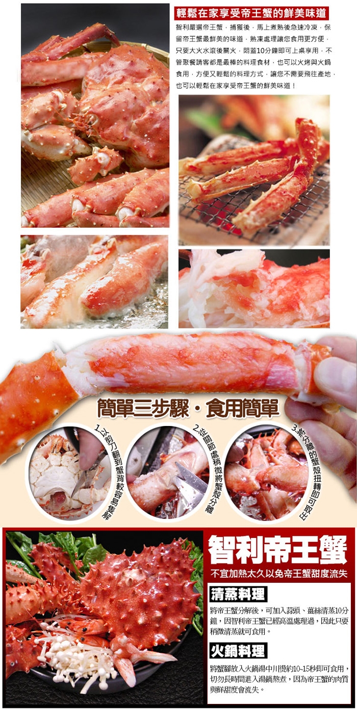 1. 帝王蟹清蒸料理:將帝王蟹分解後,可加入蒜頭、薑絲清蒸10分鐘,因智利帝王蟹以經高溫處理過,因此只要稍微清蒸就可食用。