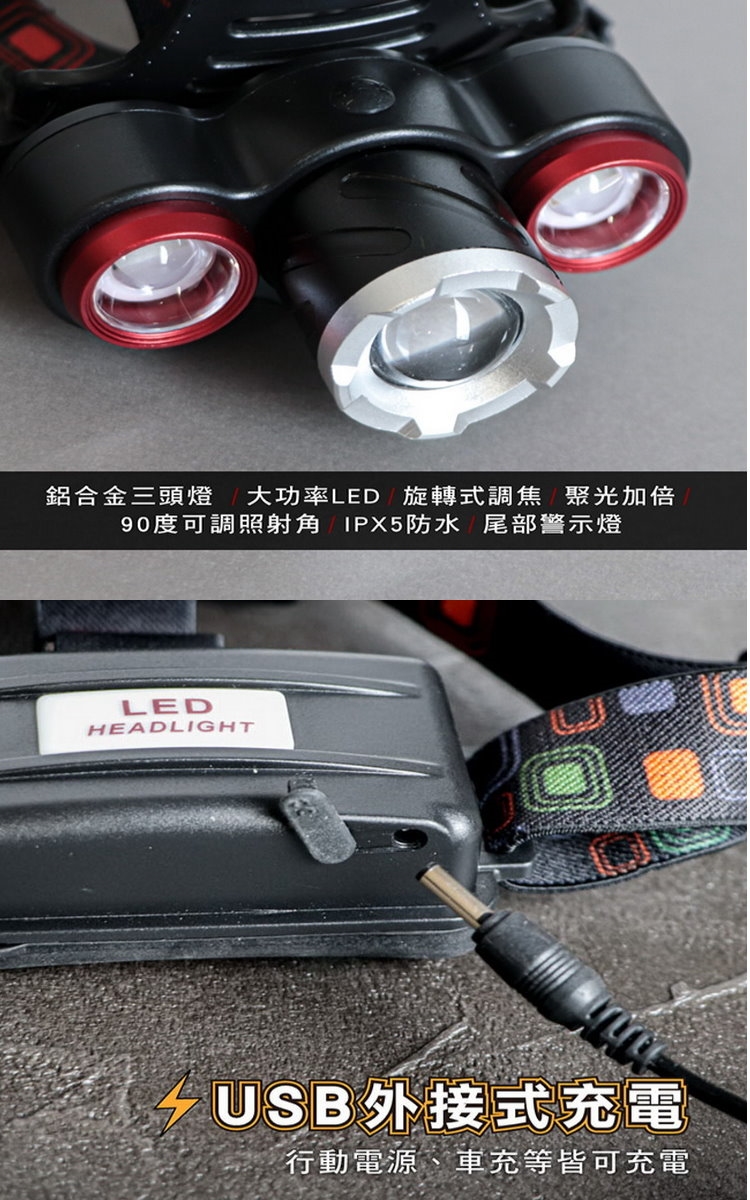 【KINYO】USB充電式三頭變焦頭燈(LED-716)