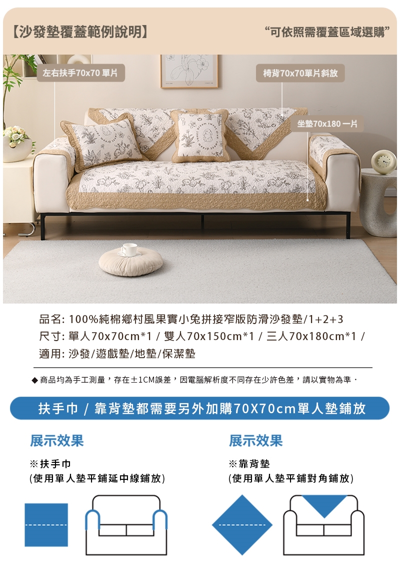 純棉鄉村風果實小兔拼接透氣舒適防滑沙發墊_1+2+3(三件組)