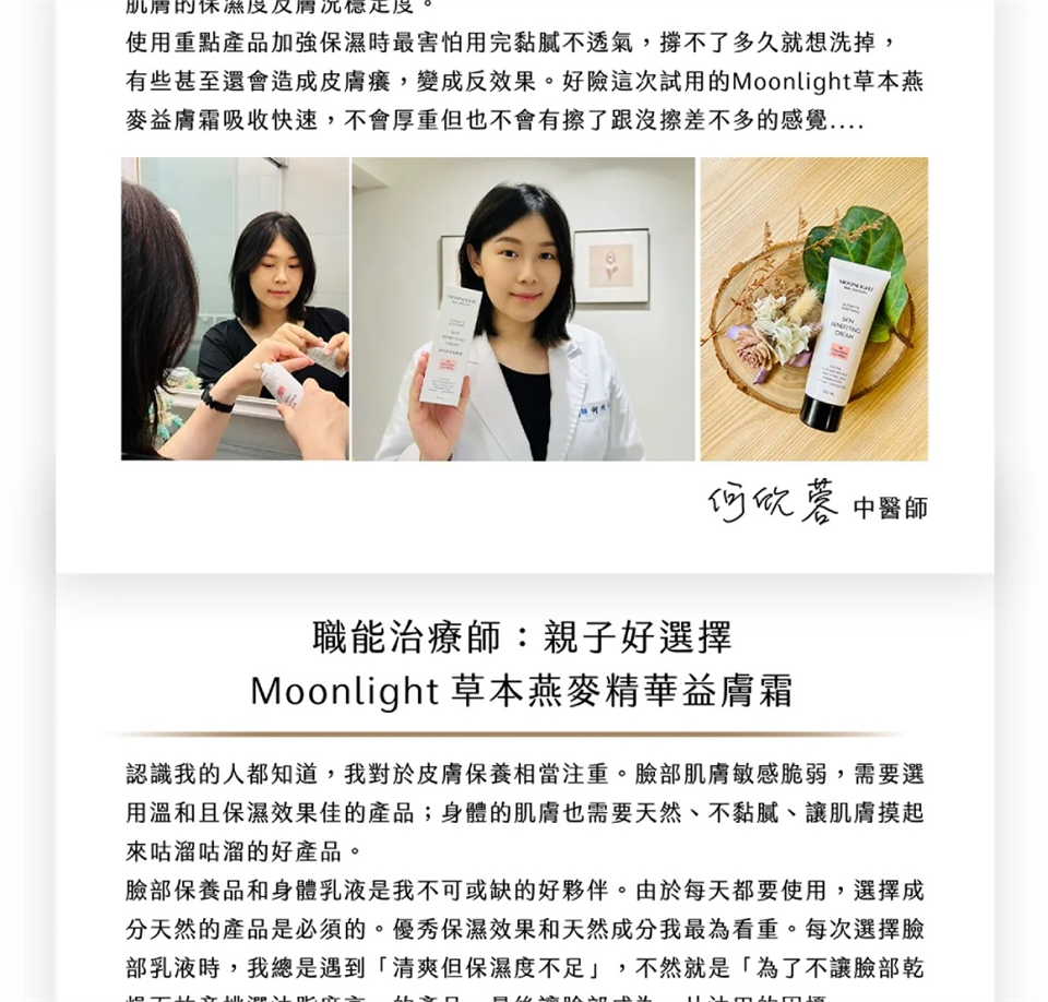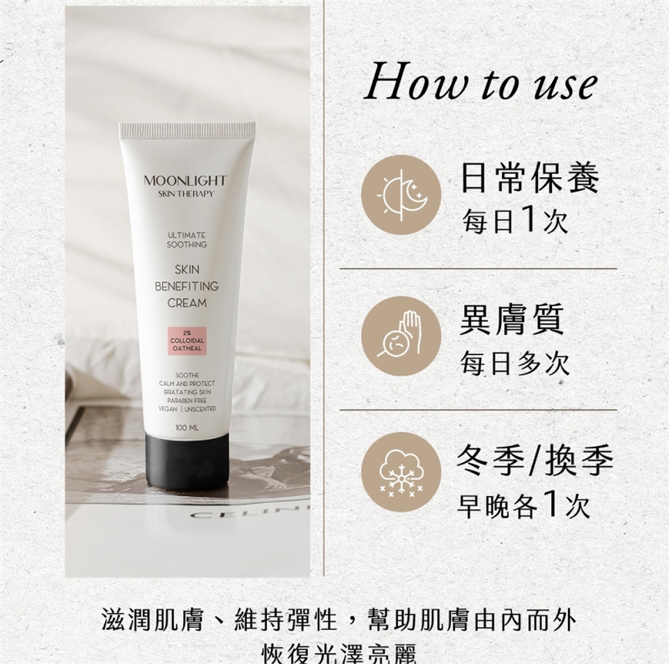 為了達到最佳效果,建議在沐浴後立即取適量的Moonlight草本燕麥益膚霜輕柔地塗抹於乾燥、敏弱、敏紅的皮膚上。