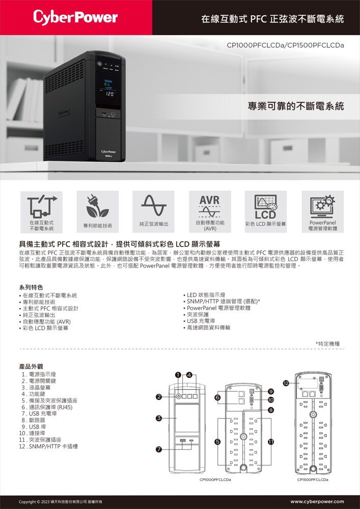 CyberPower CP1000PFCLCDa 輸出高品質正弦波給使用主動式 PFC 電源供應器的中高階電腦系統、伺服器和網絡硬體。此產品搭載獨家 GreenPower UPS™ 節能技術,可提高不斷電系統運作運作效能並降低其不必要的能源損耗,讓使用者享受比傳統不斷電系統更卓越的節能成效。 此產品內建自動穩壓功能 (AVR),能將電壓維持在可用的安全範圍,有效提升電源輸出的穩定性和效率,並具備數據線保護功能,除了保護電話、網路等設備不受突波影響外,也提供高速資料傳輸。其面板為可傾斜式彩色 LCD 顯示螢幕,使用者可輕鬆讀取重要電源資訊及狀態。此產品也可搭配 PowerPanel 電源管理軟體,方便使用者進行即時電源監控和管理。