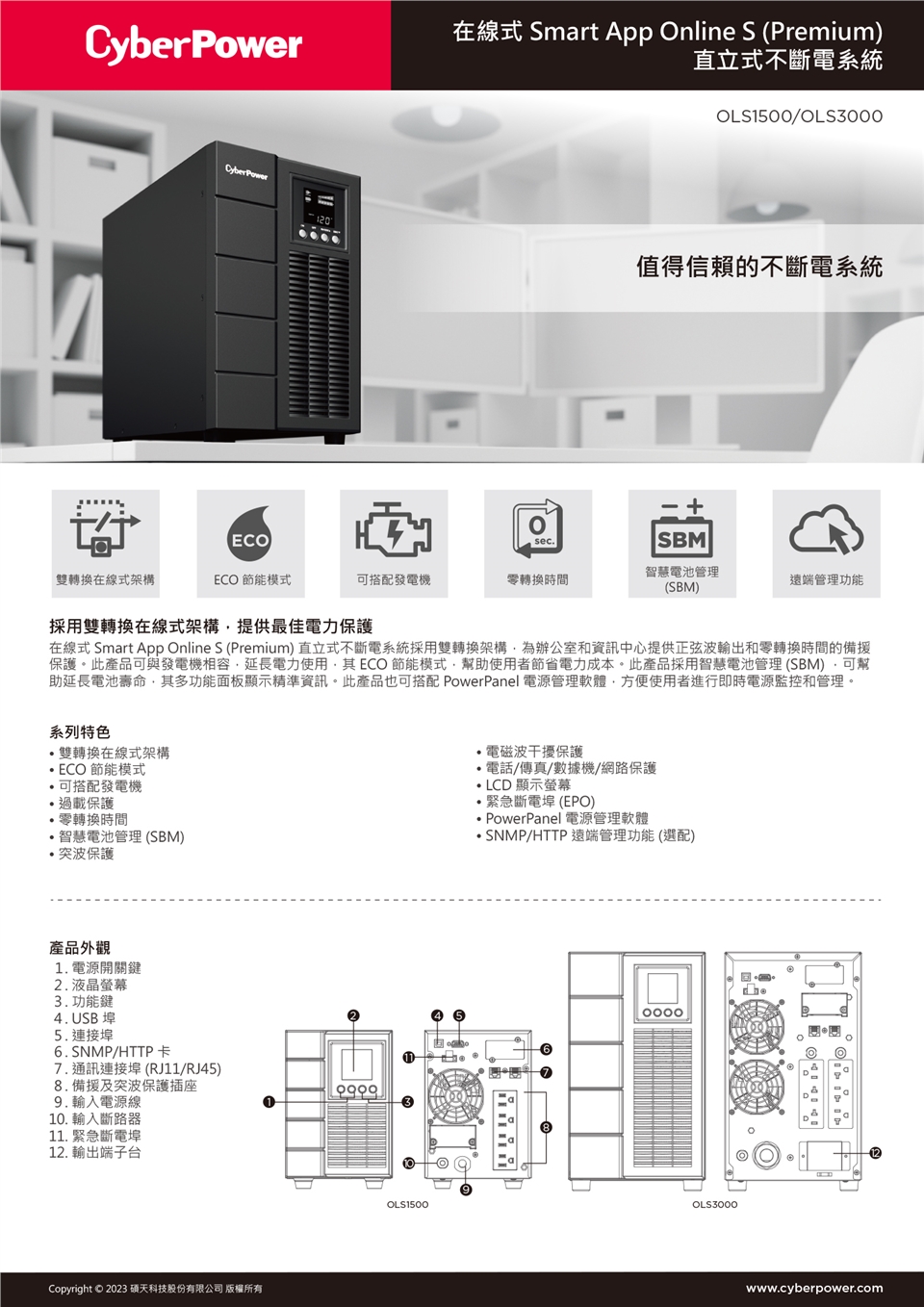CyberPower OLS3000 是高性能的不斷電系統,採用雙轉換在線式架構,輸出正弦波給NAS 儲存裝置、伺服器、DVR /監控系統、交通運輸、基礎設施和各類緊急系統等重要設備,常置於後勤辦公室、數據機房和資料中心等環境。 此產品配有維護旁路開關。維修人員透過開關切換,安全地轉換為市電供電,因此無需關閉任何連接設備,即可進行快速維修。