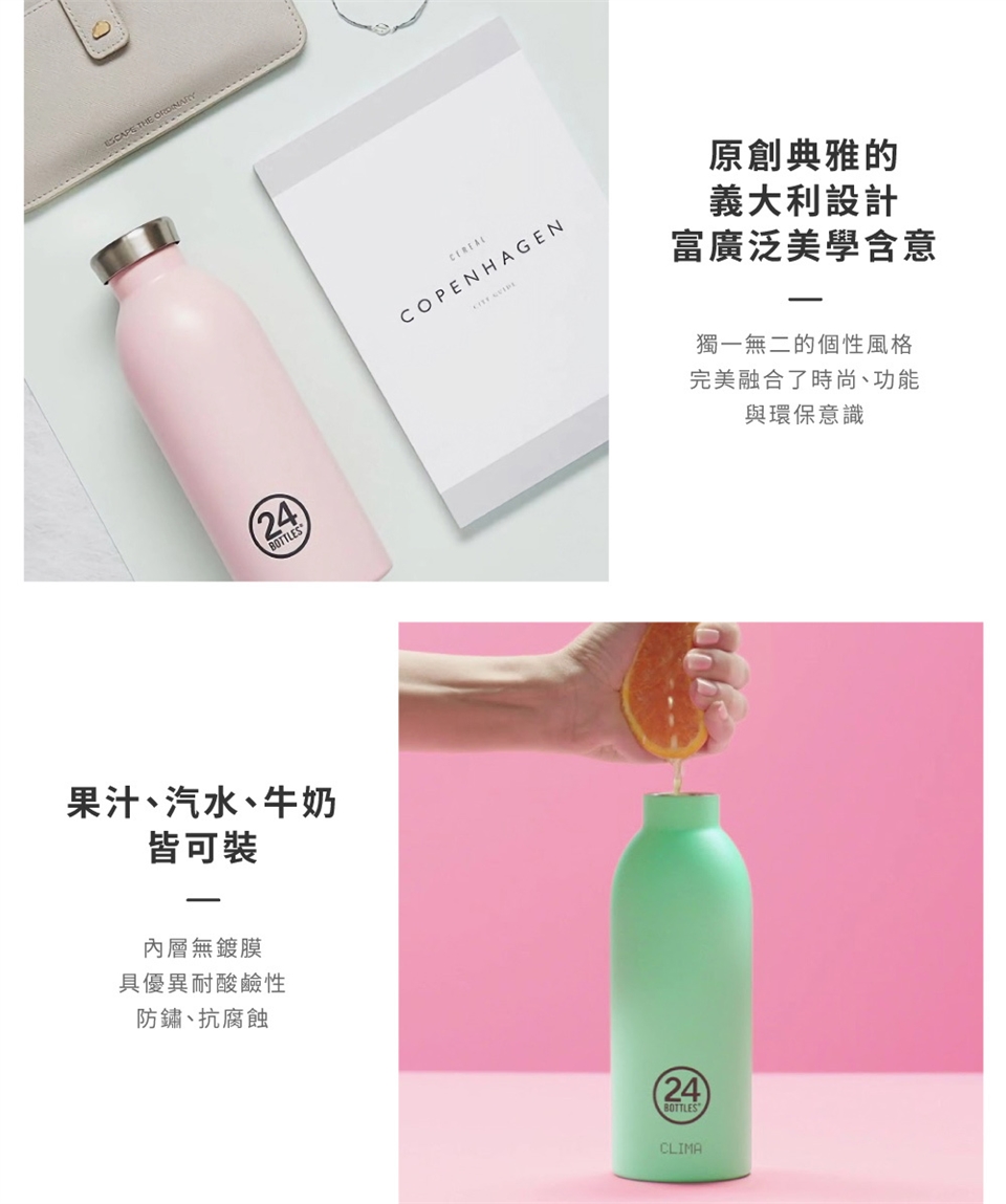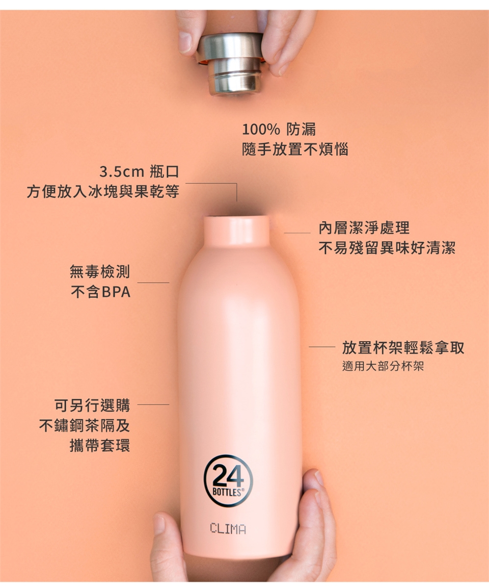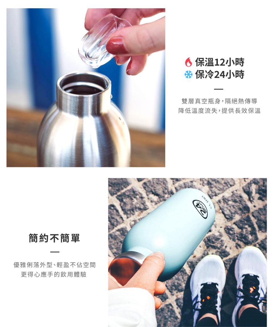 24Bottles 保溫瓶具有雙層真空斷熱層設計,有效降低熱傳導,可保溫12小時、保冷24小時。