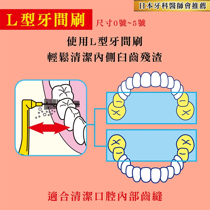 L型設計可輕鬆清除牙齒後側臼齒、兩頰旁的齒縫。