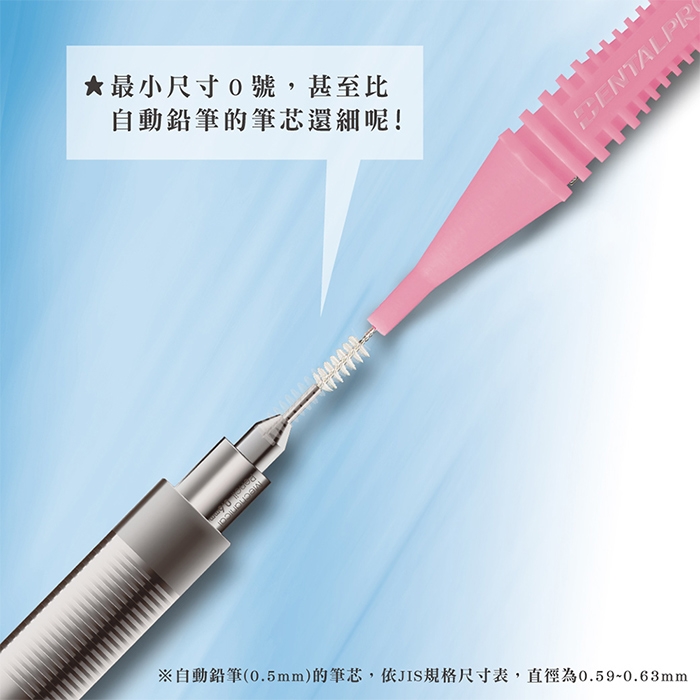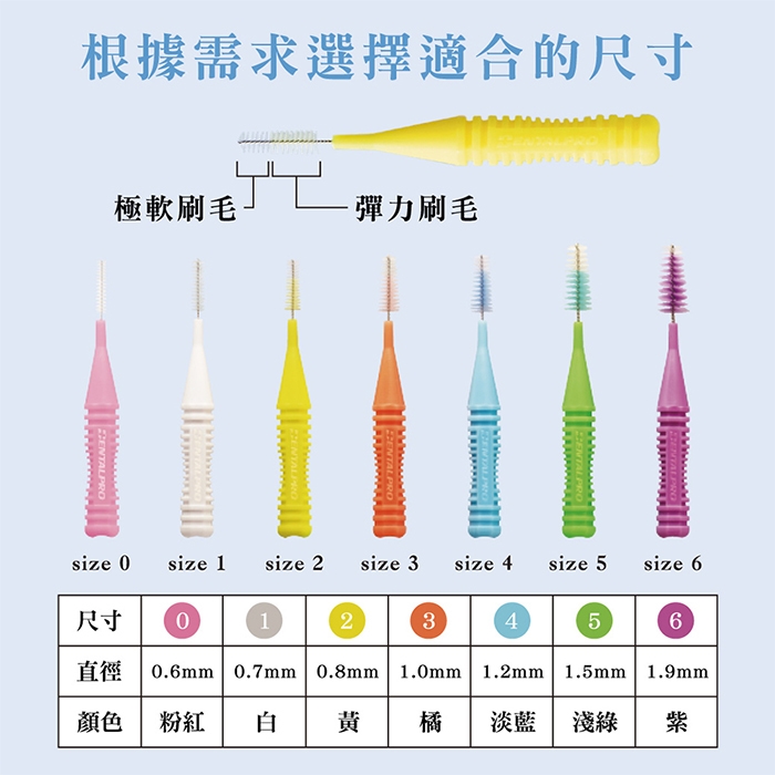 雙重組合刷毛,前段極軟,輕鬆插入不易傷害牙齦;後段彈力,增強清潔效果。( 0號及1號則非此種式樣)