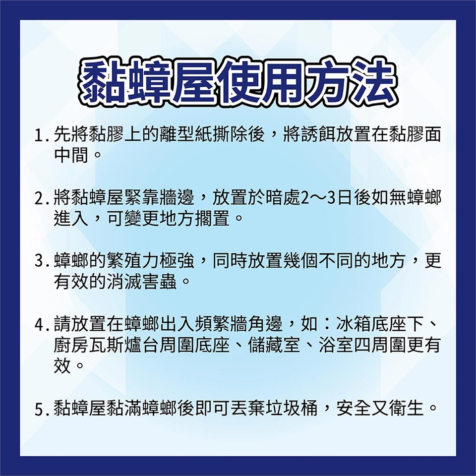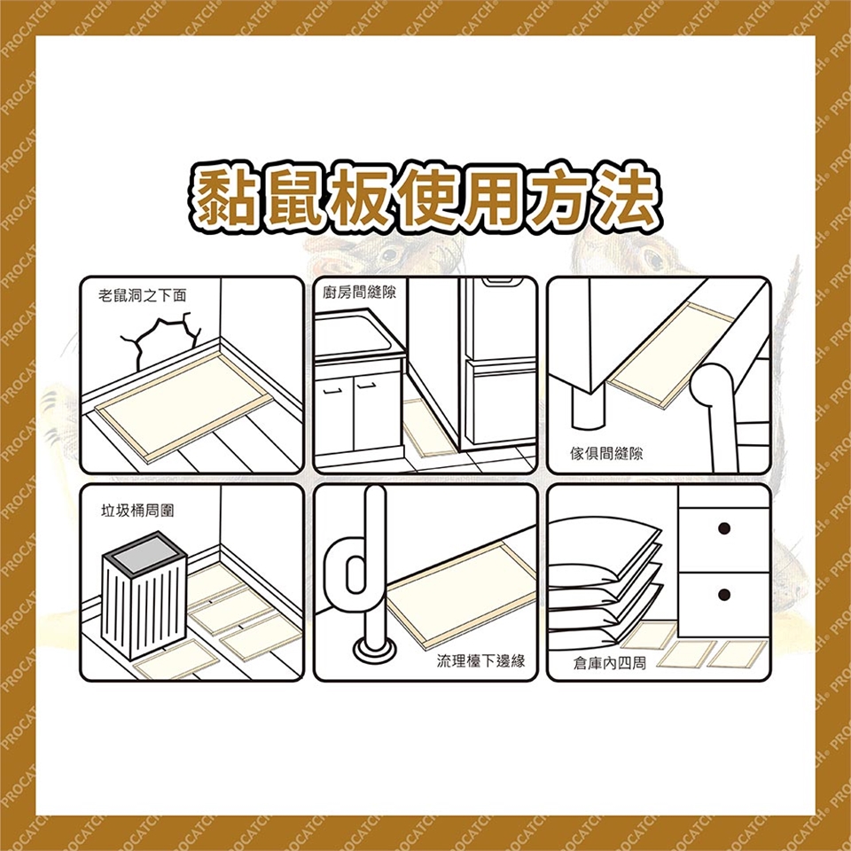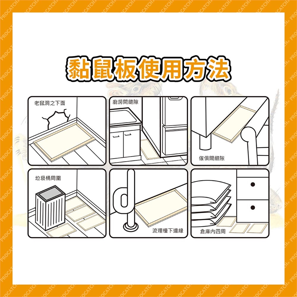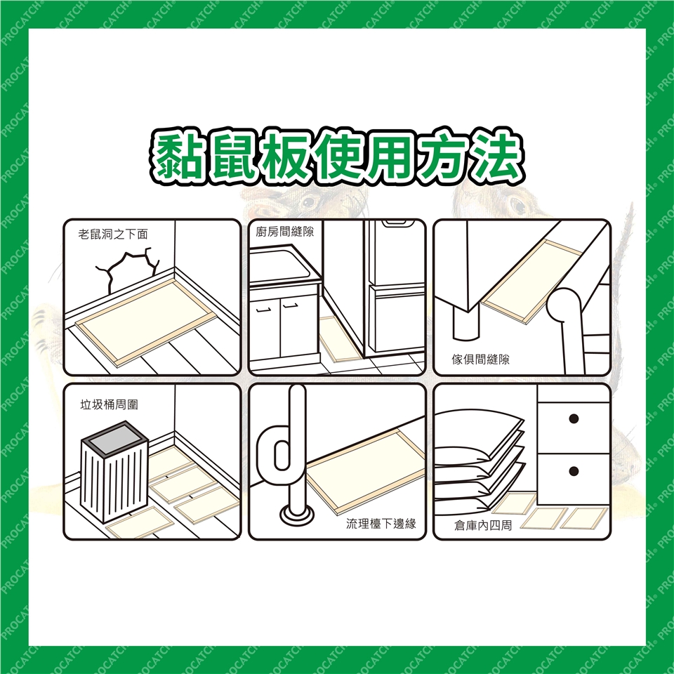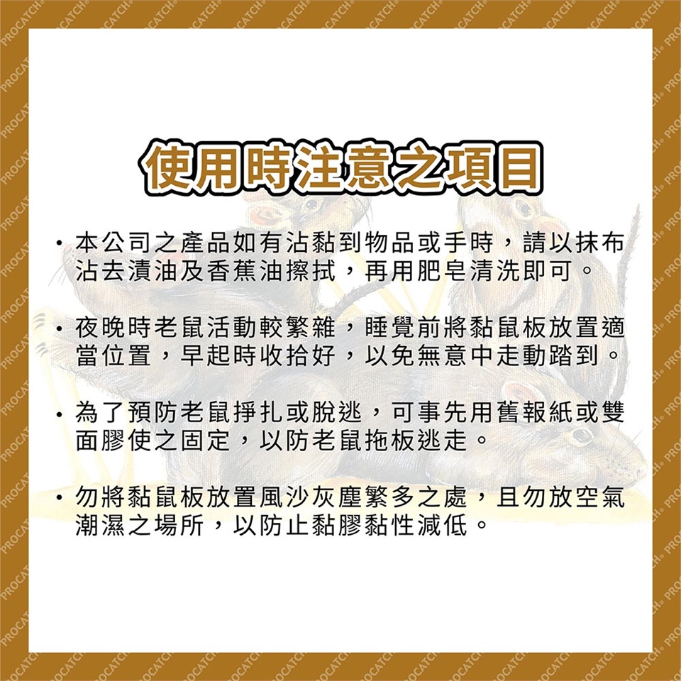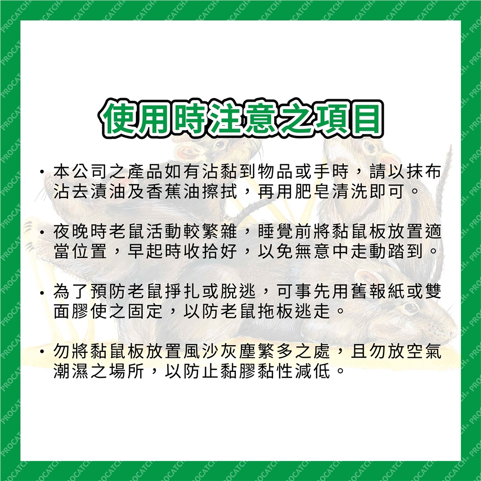 ◎ 夜晚時老鼠活動較繁雜,睡覺前將黏鼠板放置適當位置,早起時收拾好,以免無意中走動踏到。