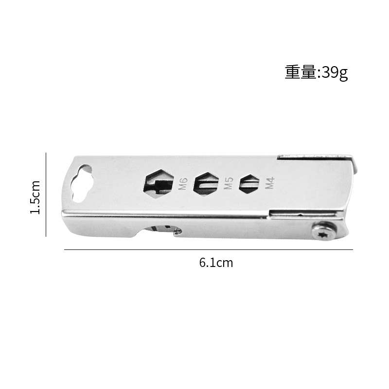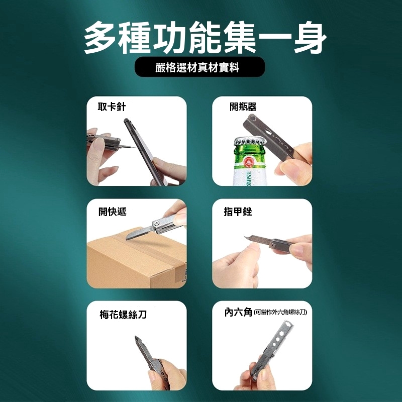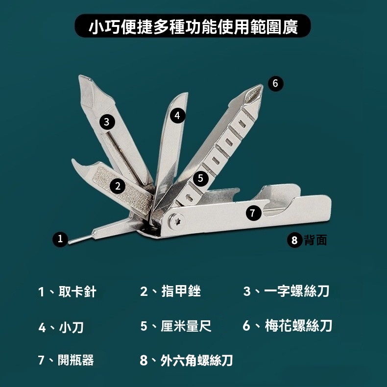 功能:手機取卡針、指甲銼、一字螺絲刀、小刀、公分量尺、梅花螺絲刀、開瓶器、外六角螺絲刀(M4、M5、M6內六角孔)