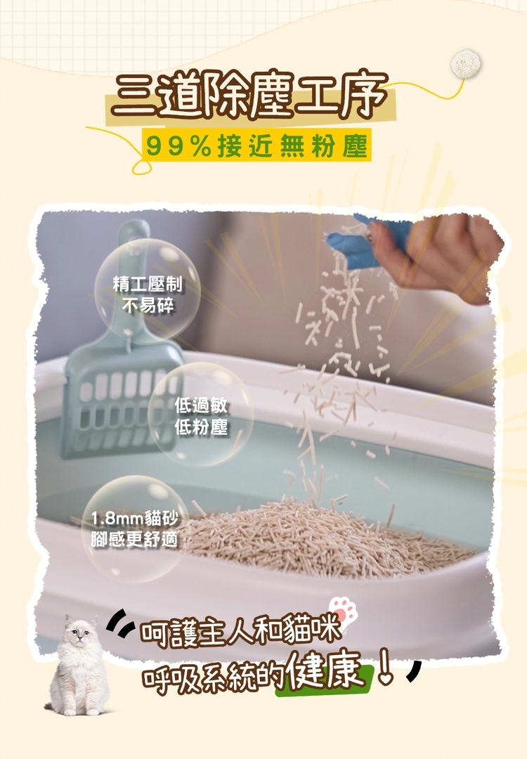 - 貓砂除臭新革命,珪藻土添加專利:經 SGS 檢測,24 小時長效消臭,保持空間清新健康。