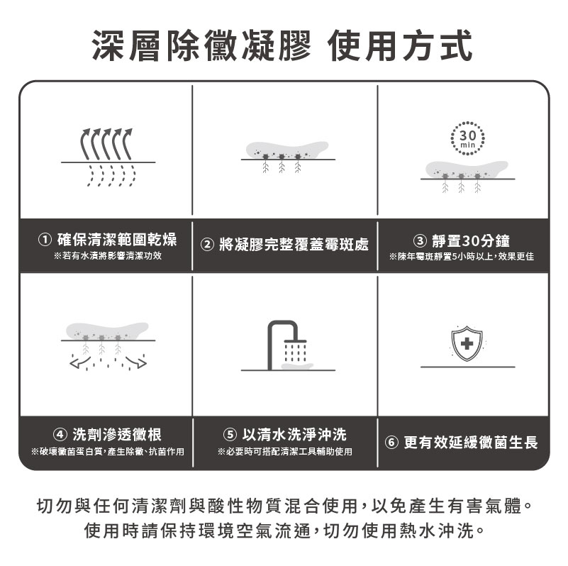 ※矽利康上根深蒂固的黴菌,建議靜置5小時以上時間加強凝膠滲透效果,去黴力更佳。