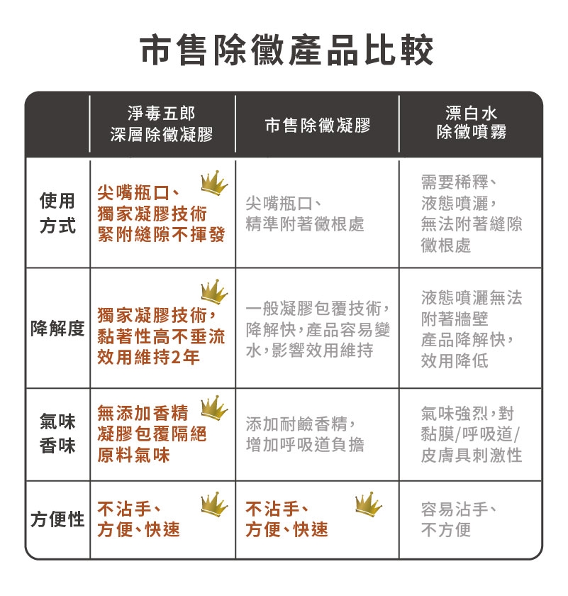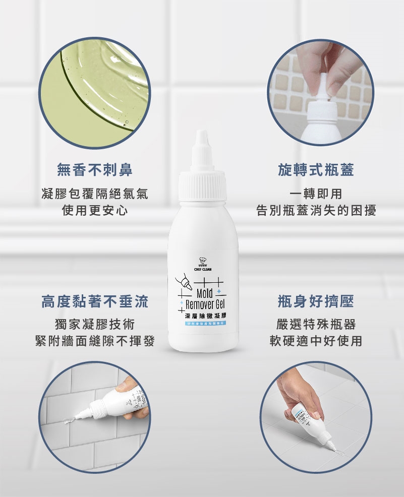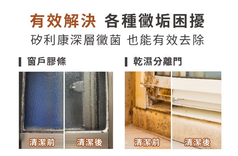 - 採獨家包覆技術,使次氯酸鈉有效深入分解黴根,達到去黴及預防再生效果