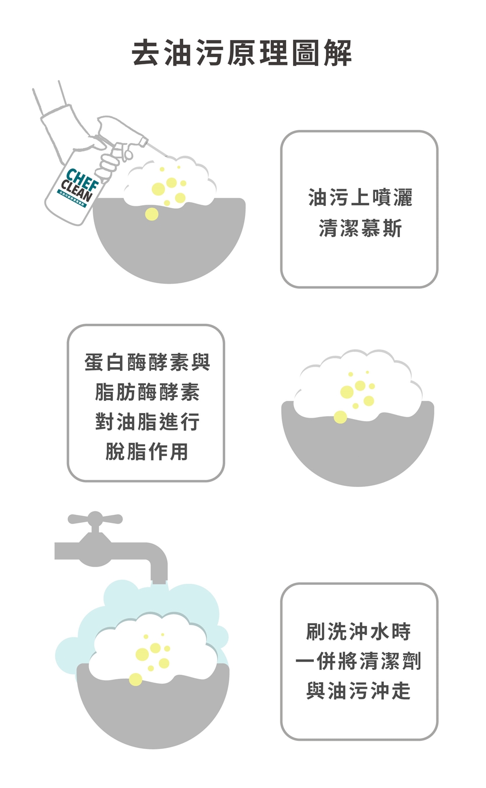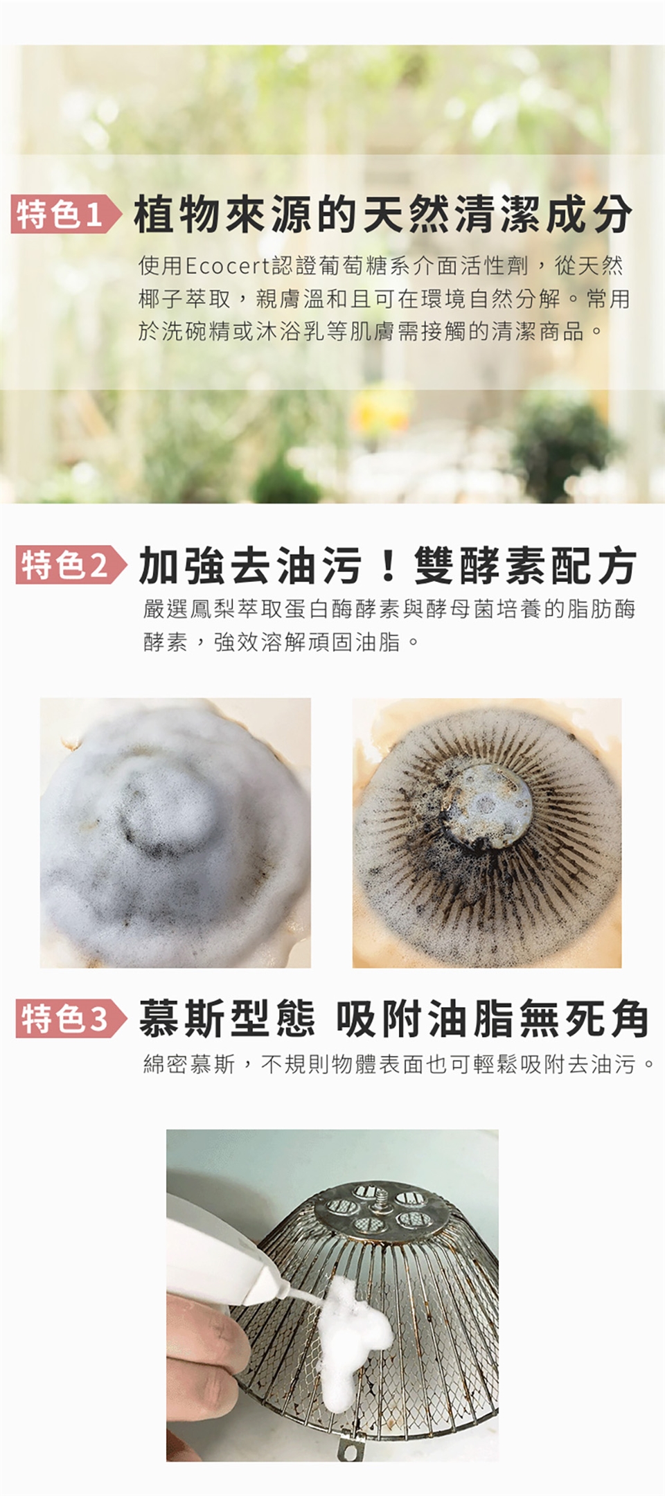 - 加強去油雙酵素,蛋白酶酵素與脂肪酶酵素。