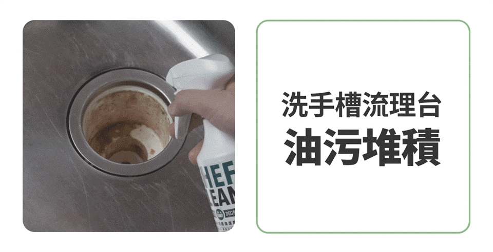 1.針對油污區塊做噴灑覆蓋,靜置約20分鐘後使用抹布或菜瓜布刷洗,再用清水清洗乾淨