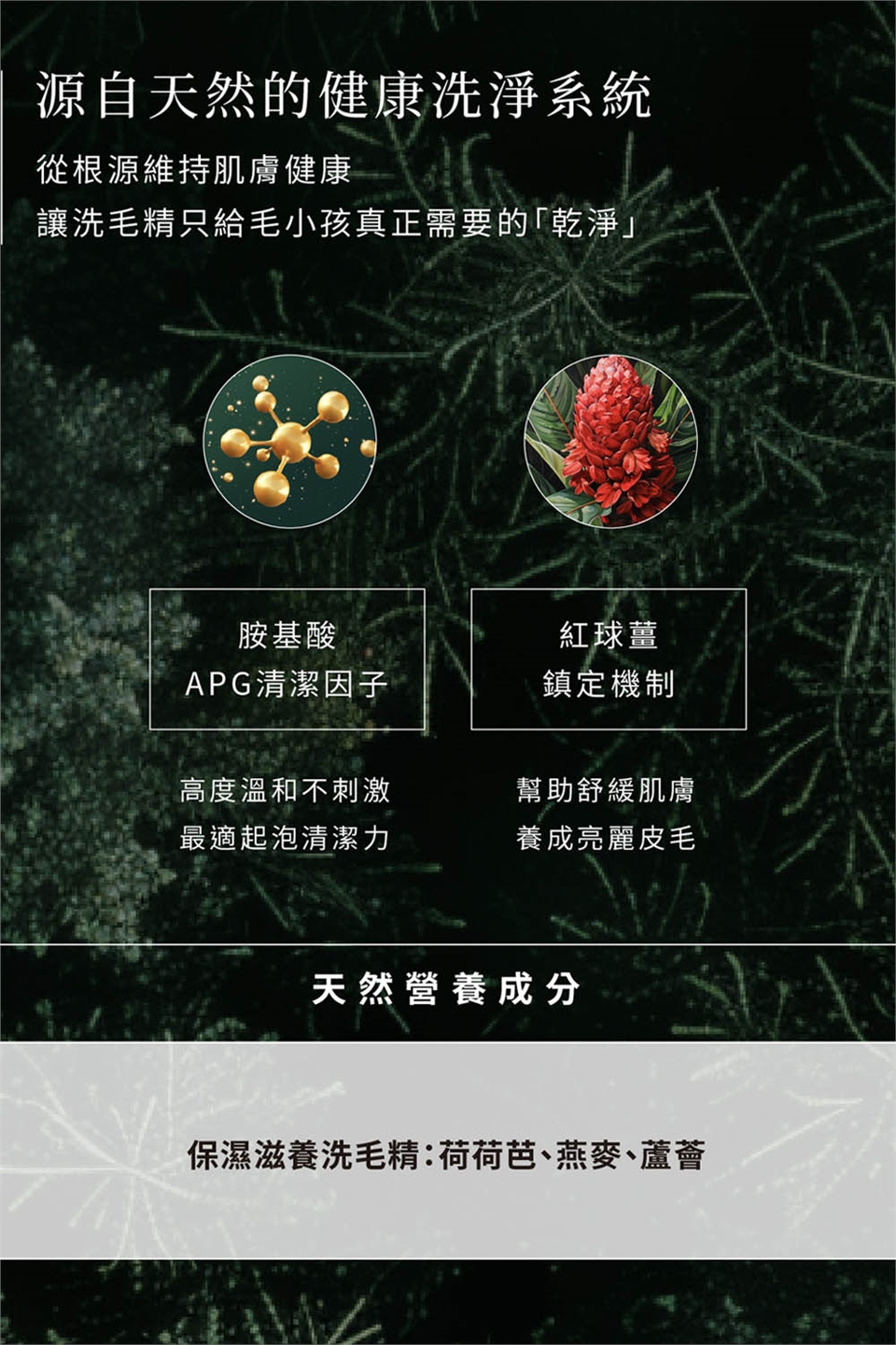 由超過91%天然成分精心配製,含紅球薑等天然精華,專為台灣濕熱氣候設計,為寵物皮膚和毛髮提供保濕、滋養和補充水份,並保護皮膚的水分平衡,幫助毛皮健康,使寵物毛髮健康亮麗。可作為日常使用的洗毛精,適合從幼犬到老犬的各種毛髮類型。
