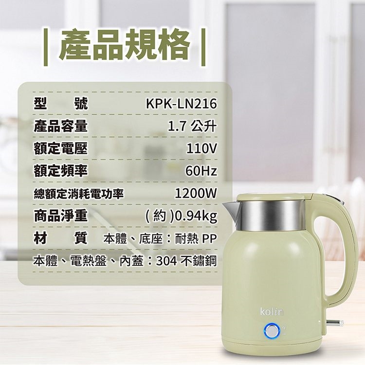 Kolin歌林 1.7L復古美型定溫大容量快煮壺 KPK-LN216