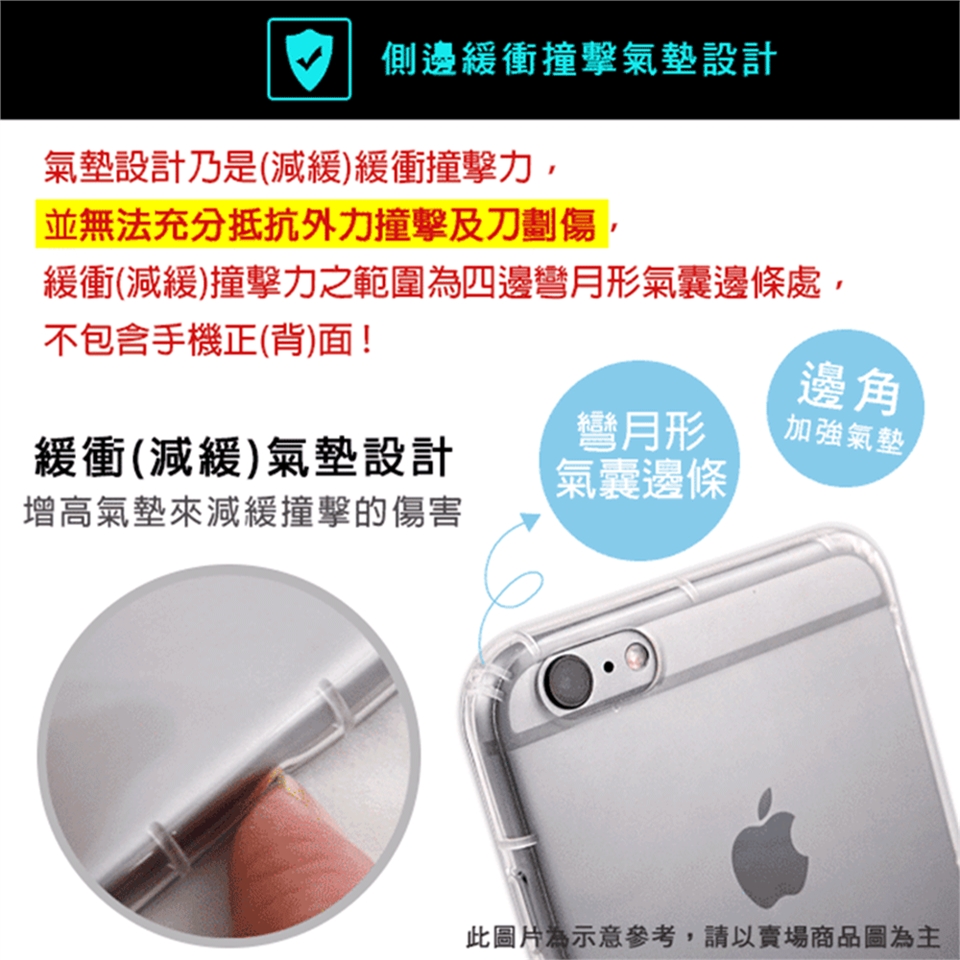 註1. 氣墊設計乃是(減緩)緩衝撞擊力,並無法充分抵抗外力撞擊及刀劃傷 緩衝(減緩)撞擊力之範圍為四邊彎月形氣攘邊條處,不包含手機正(背)面