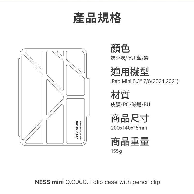 包裝內容物:JTLEGEND iPad mini 8.3'' 2024/2021 Ness 相機快取多角度折疊防潑水布紋保護殼(含Apple pencil磁扣*1)