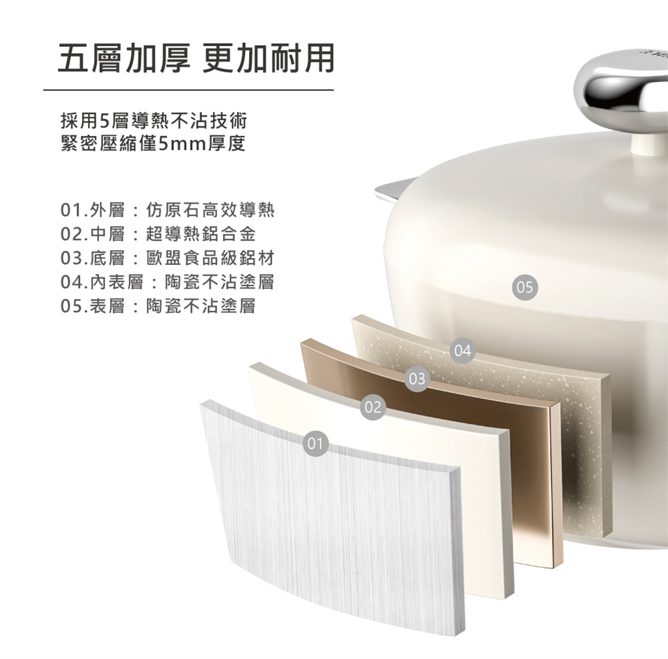 ➔導熱快受熱均勻:五層導熱不沾技術,加厚更加耐用