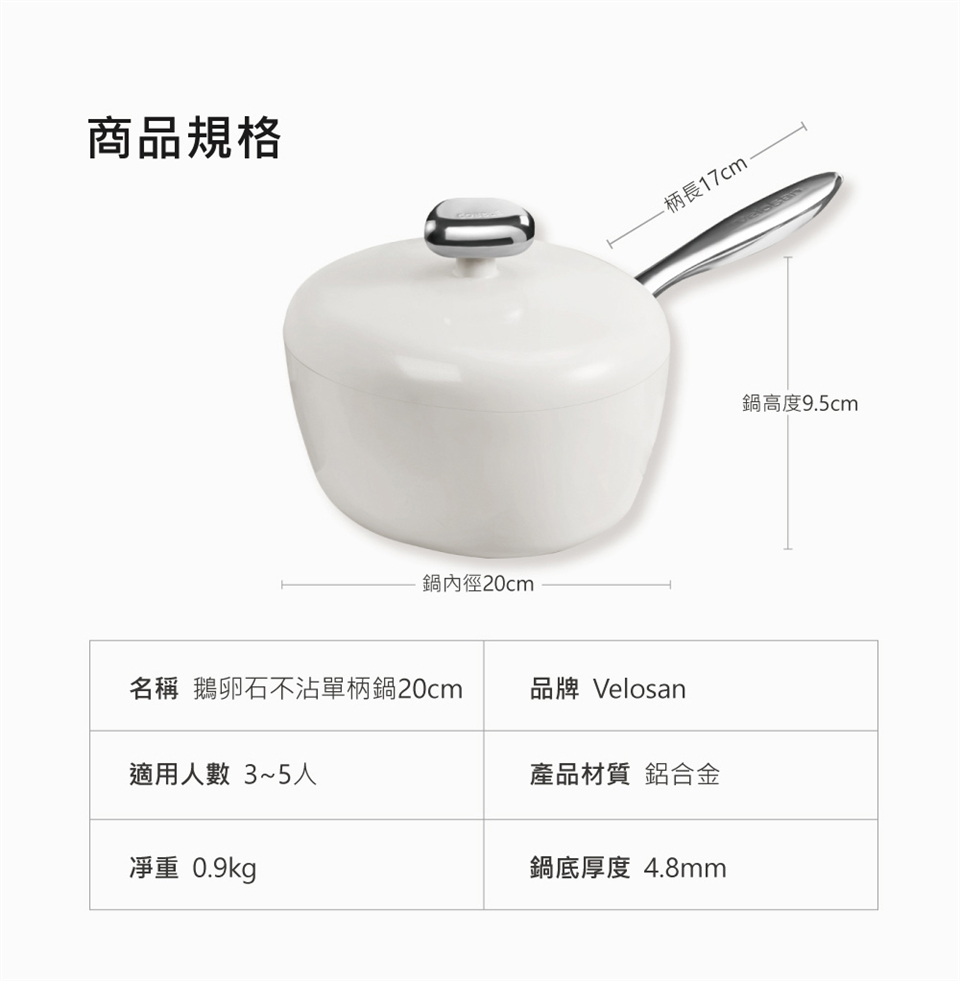➔人體工學LOGO鍋柄:符合人體工學手柄,細節刻有Velosan logo字樣,好施力不費力好握不燙手。