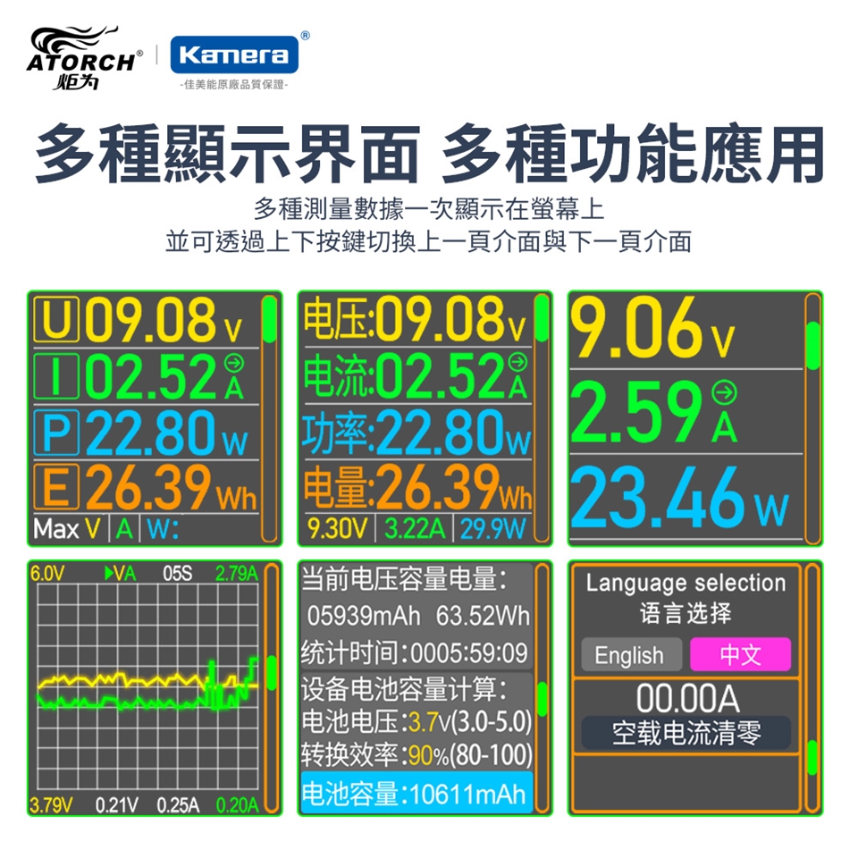 - 支援雙向電流測試,精準計算電池容量,並記錄充電峰值。