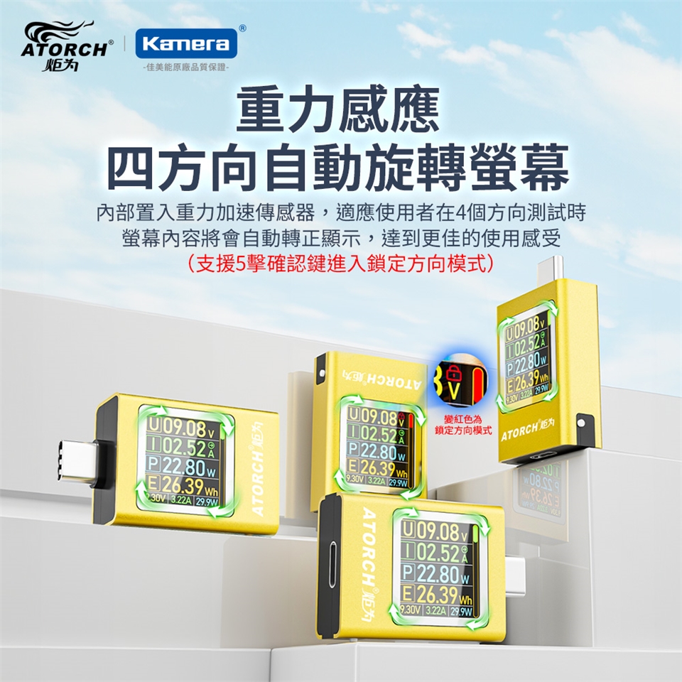 - 重力感應四向旋轉螢幕,方便各角度閱讀測試數據,達到更佳的使用感受。