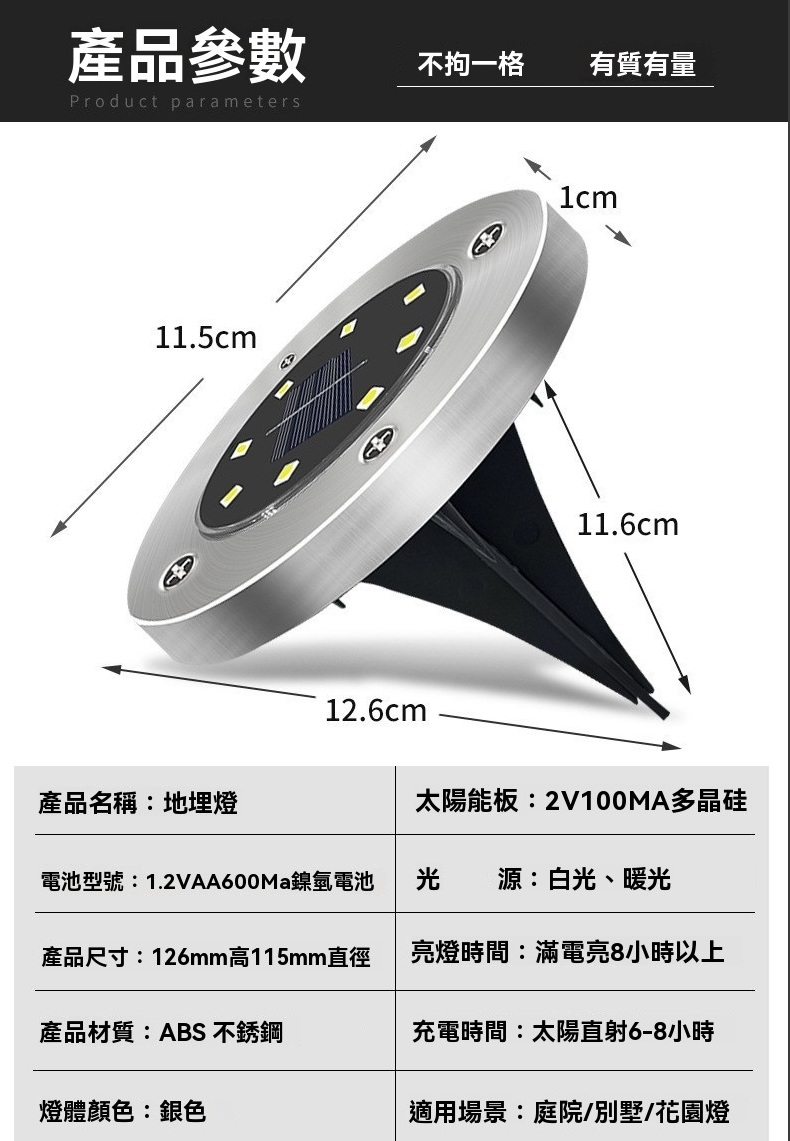 材質:ABS、不鏽鋼、多晶硅太陽能板、8顆LED