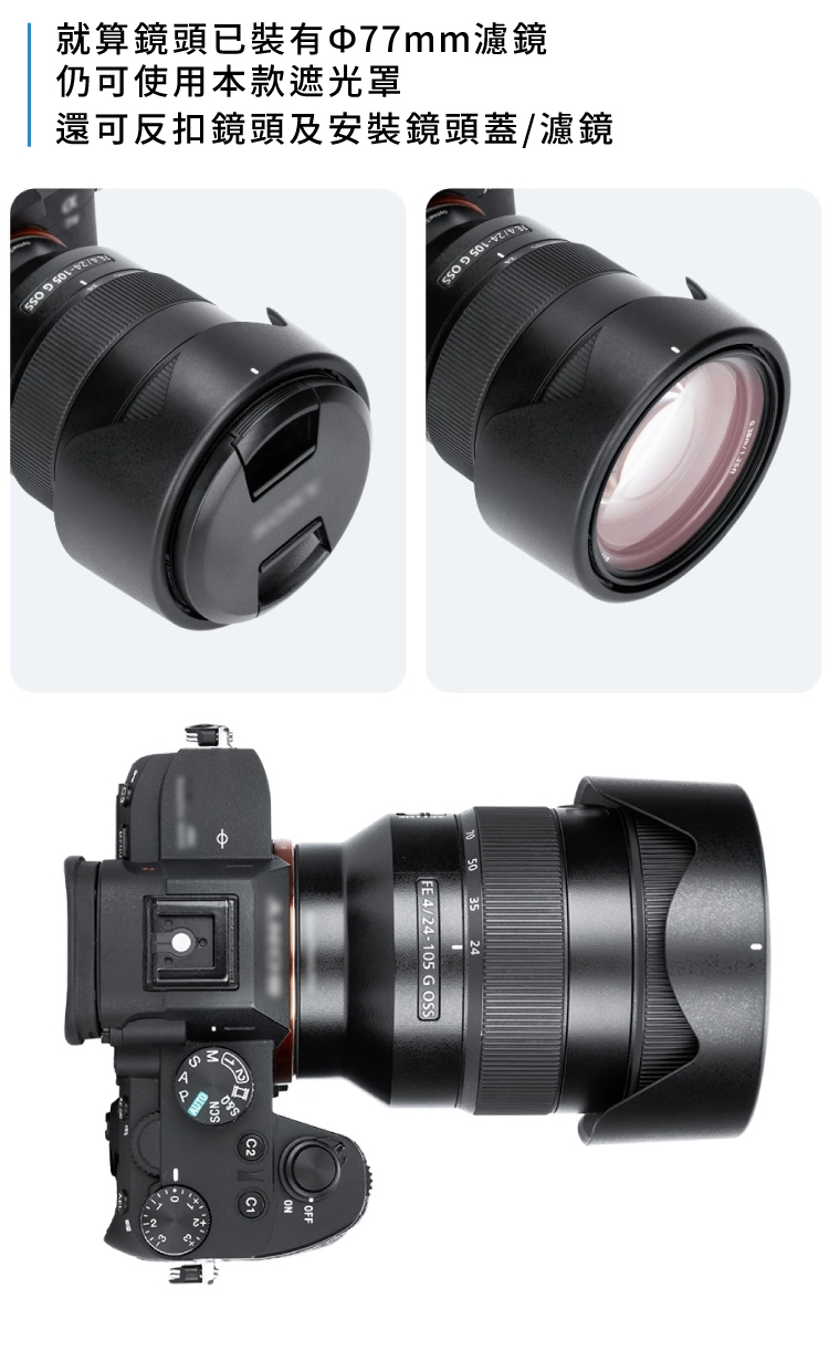 ●就算鏡頭已裝有Ф77mm濾鏡,仍可使用本款遮光罩,還可反扣在鏡頭上,以及安裝原先的鏡頭蓋。