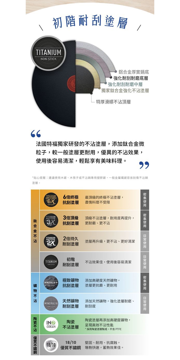 ◎ 鍋具材質:鋁合金、Titanium鈦合金強化塗層(PTFE,耐熱溫度250°C)、PTFE烤漆外層、電木把手