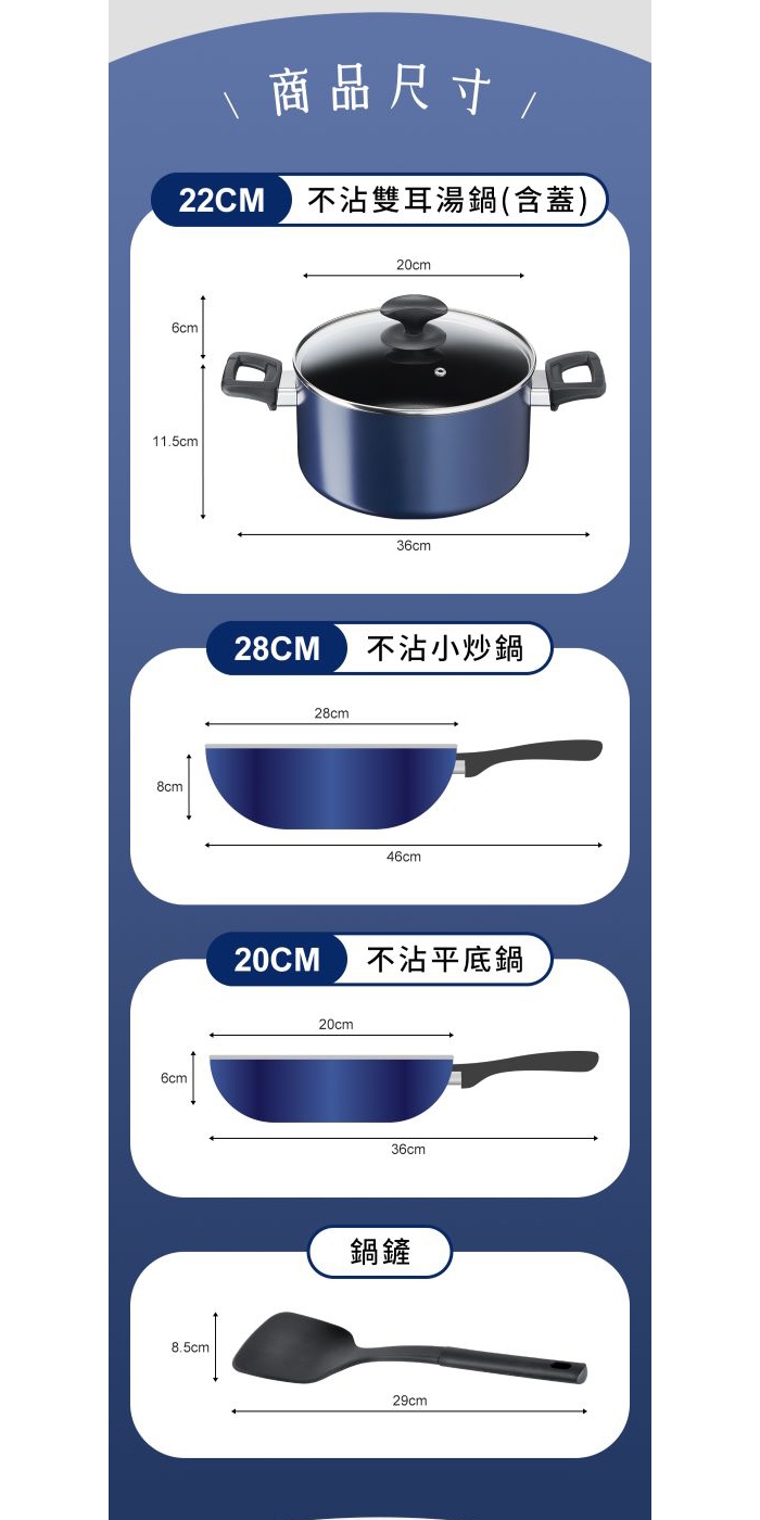 ◎ 內容物:28炒鍋+20深平底鍋+22湯鍋+湯鍋鍋蓋+鍋鏟