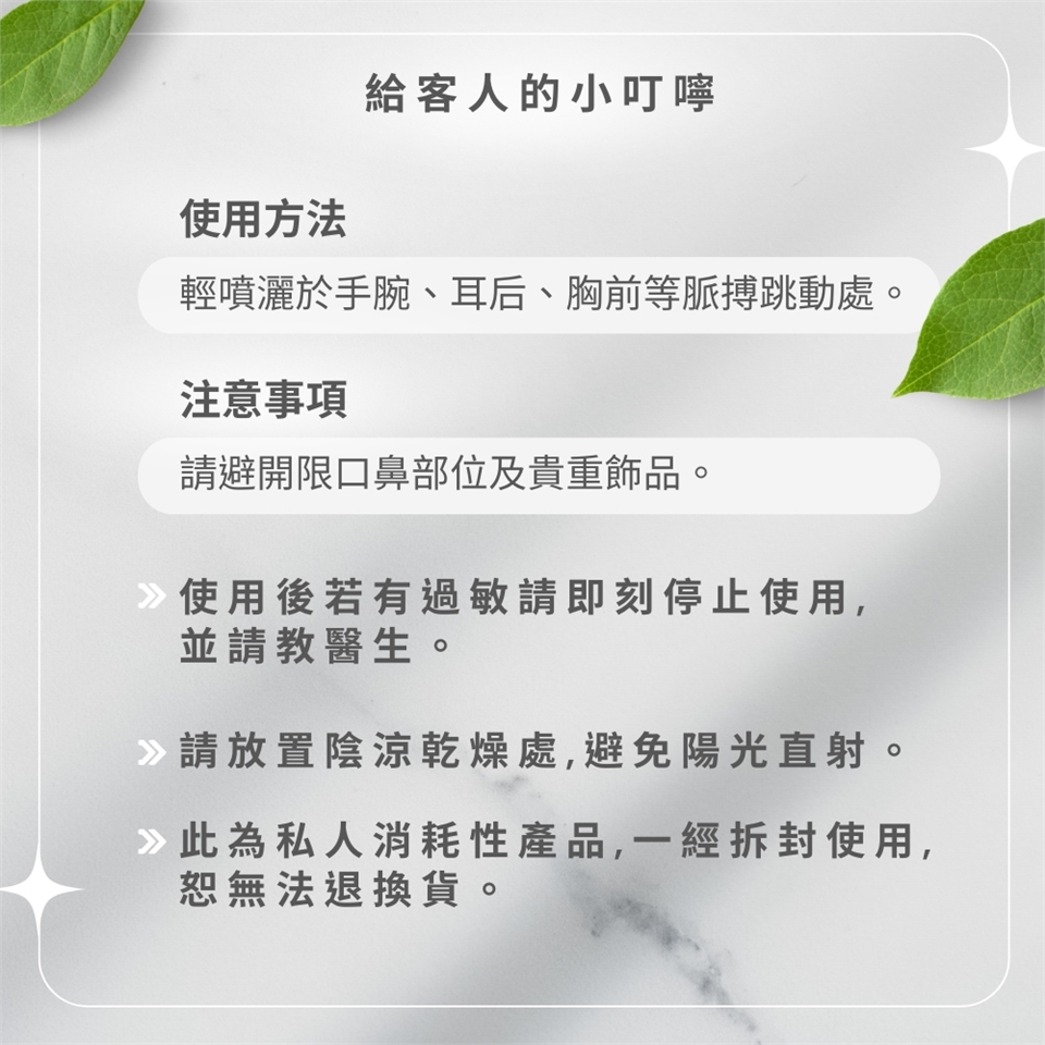 輕噴灑於手腕、耳後、胸前等脈搏跳動處。