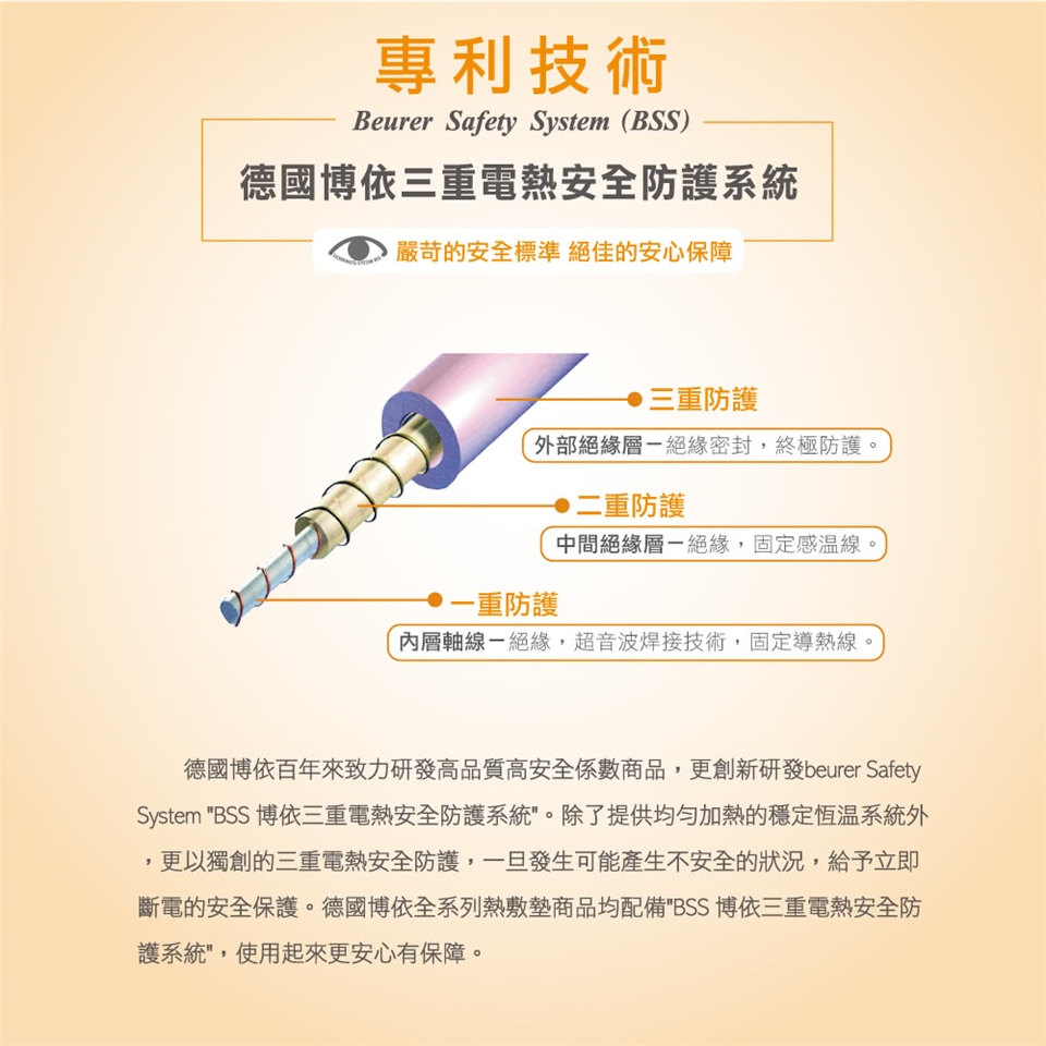除了保暖功用外,透過熱敷也能幫助促進血液循環與放鬆肌肉。配備有德國博依三重電熱安全防護系統(BSS), 3 段溫度控制,90 分鐘自動關機與速熱功能,更提升操作使用的安全性。