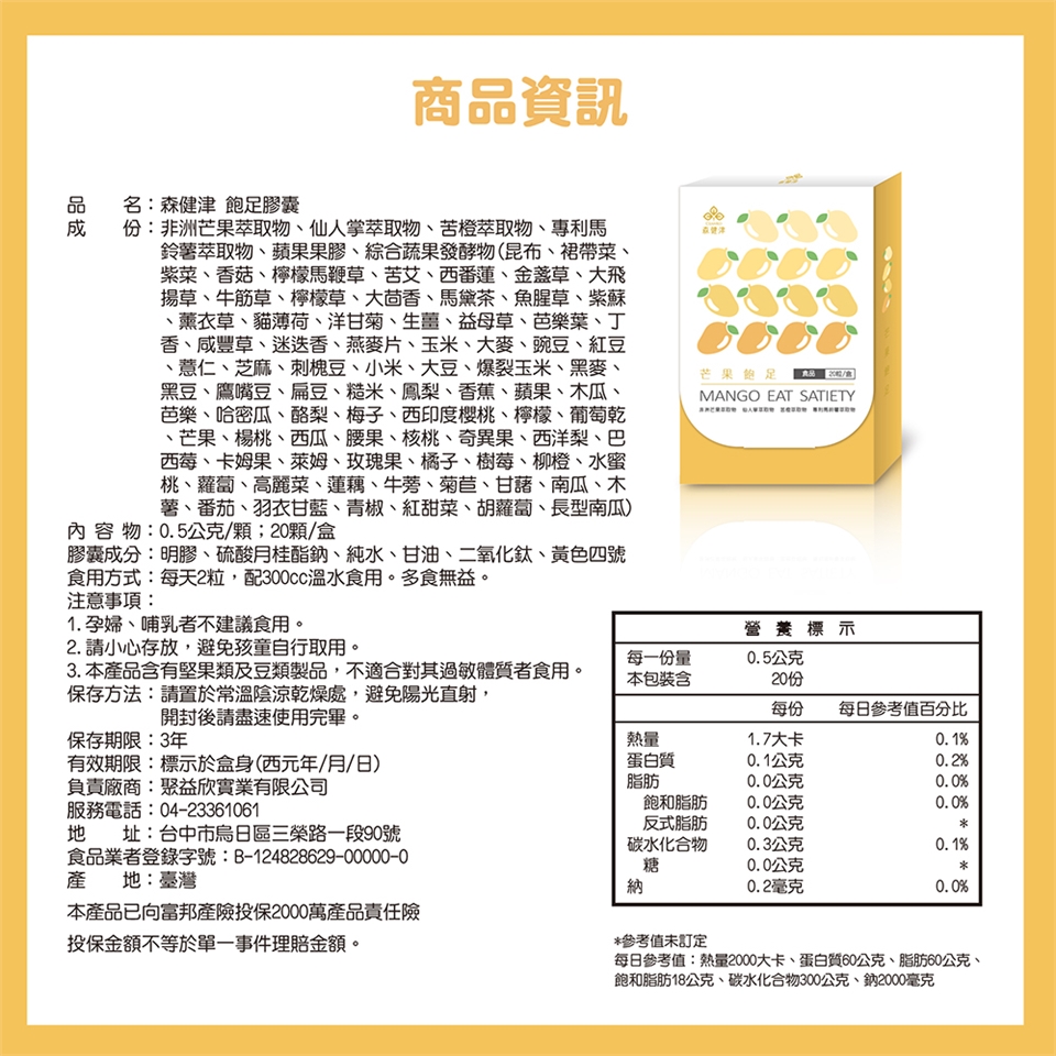 芒果飽足:每天2粒,配300cc溫水食用。多食無益。