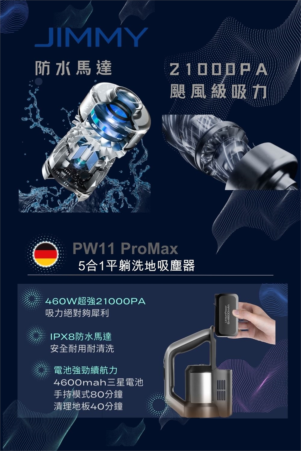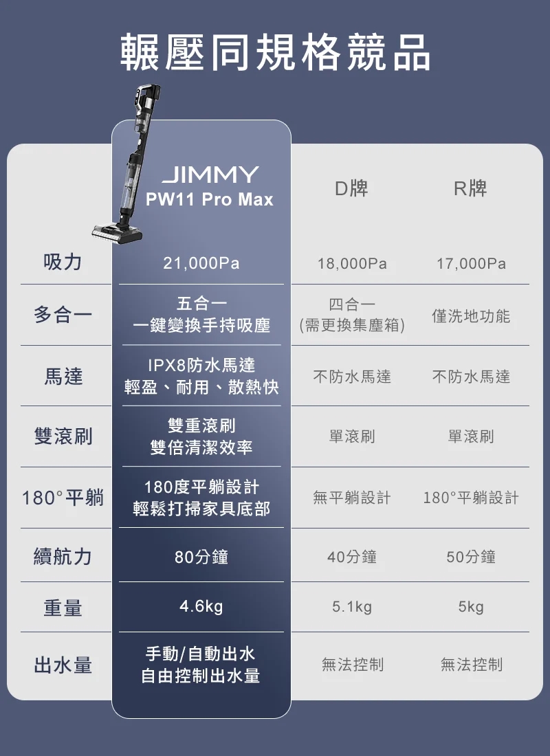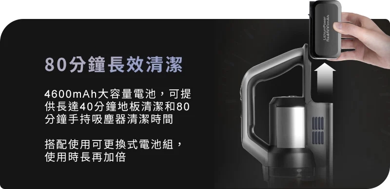 長效電池續航:洗地模式43分鐘、乾吸模式80分鐘