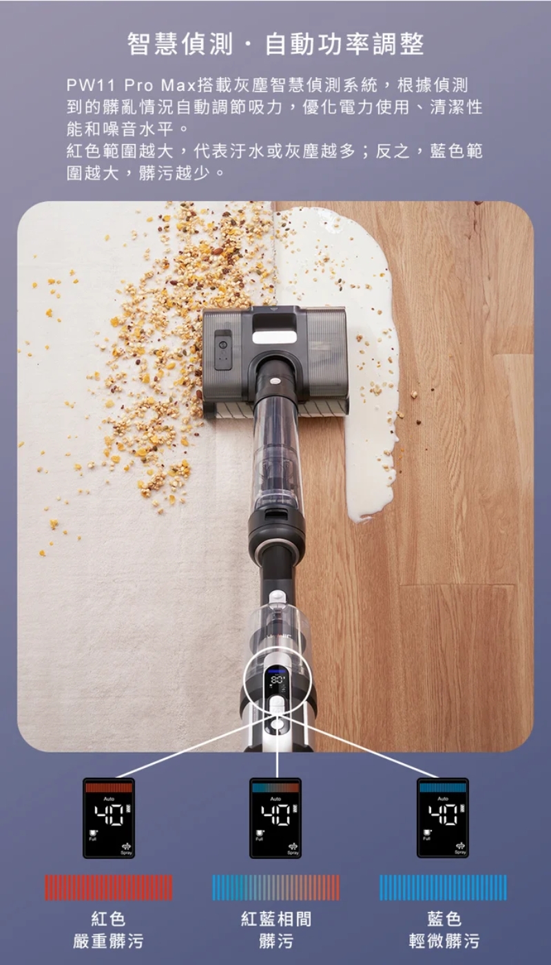 智慧髒污偵測調整清潔吸力及水量