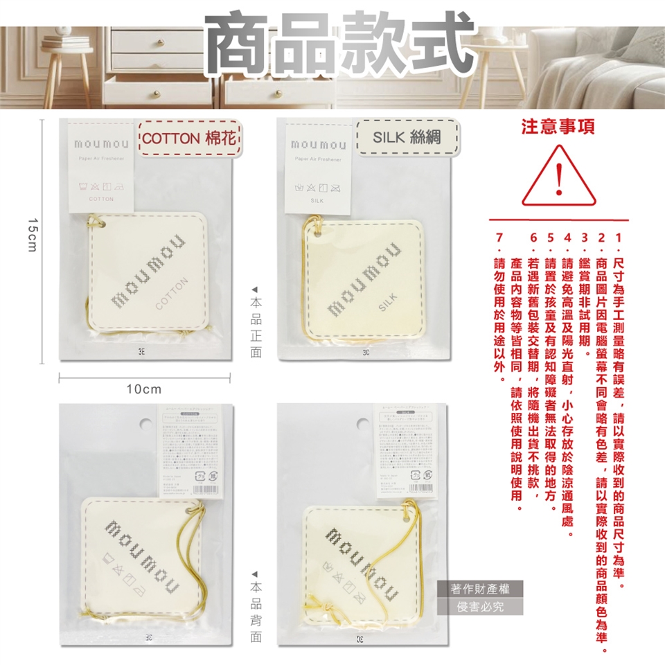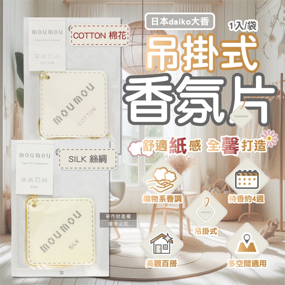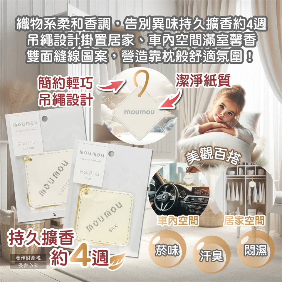 ●品名:MOUMOU居家車內空間織物芬芳吊掛式香氛片