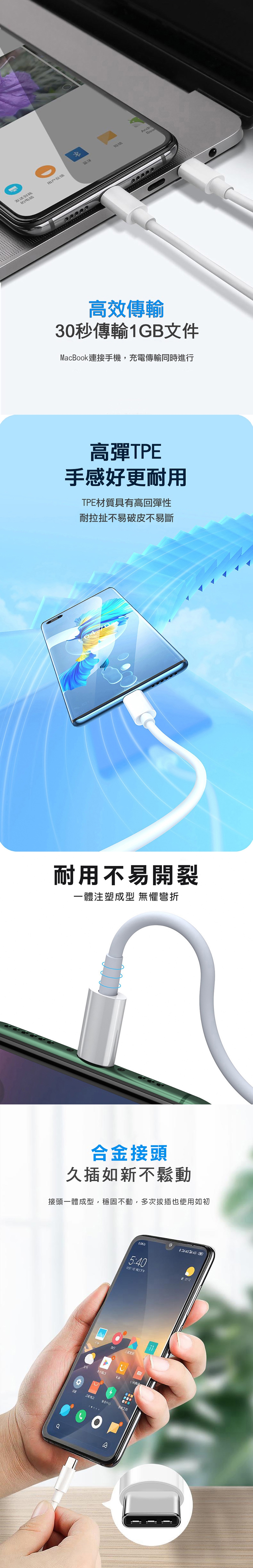 .耐彎折,不斷裂,採用TYPE-C原裝端子頭,加固加厚線材,抗氧化不生鏽。