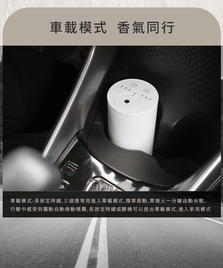 行駛中感受到震動自動啟動噴霧,長按定時鍵或關機可以退出車載模式,進入家用模式