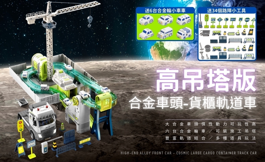 【內容】合金車頭、拖車貨櫃、軌道、爬坡道、吊塔、6台小車、34件路障工具、貼紙、說明書