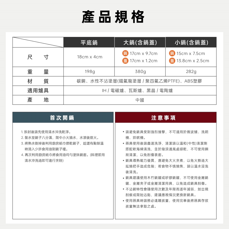 1.請避免鍋具受到強烈撞擊,不可適用於微波爐、洗碗機、烘碗機。