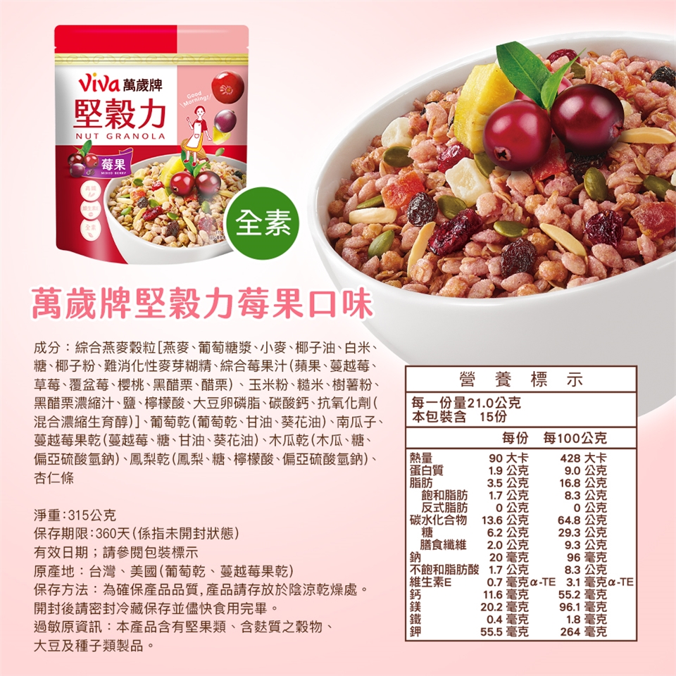 過敏原資訊:本產品含有堅果類、含麩質之穀物、大豆及種子類製品。