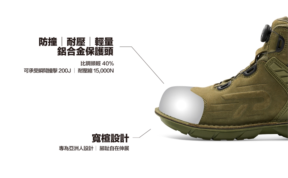 輕量鋁合金製成,較傳統鋼頭輕 40% 且增加鞋內空間