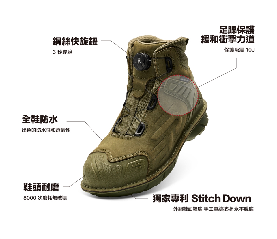 SD鞋面外翻與鞋底手工車縫,實現永不脫底", 適合室外作業、極限環境、或需要長時間行走、站立、需耐火星、防水及絕緣工作者,高度穩定及保護性是你的首要考量。