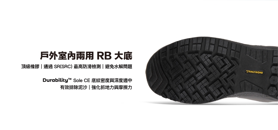 雙層密度橡膠大底,有效避免水解狀況。底紋設計能減少泥土或其它雜物積存,易於清潔,並具備易彎曲、耐磨、防扭功能設計"