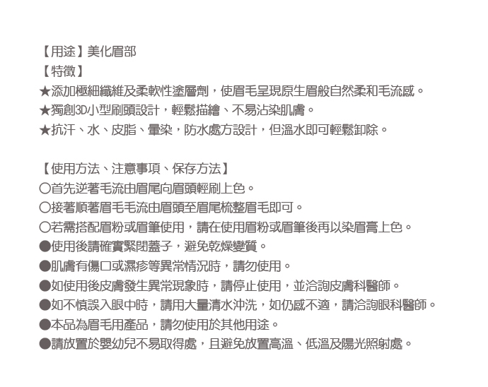 ○若需搭配眉粉或眉筆使用,請在使用眉粉或眉筆後再以染眉膏上色。